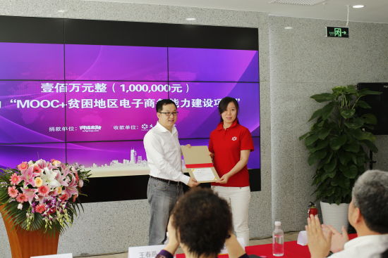 网信金融集团作为项目的支持方之一,在活动现场向友成基金会扶贫志愿者行动计划捐赠人民币100万元,用于“MOOC+贫困地区电子商务能力建设项目”的试点启动。扶贫志愿者行动计划主任孙毅向众筹网CEO孙宏生颁发了捐赠证书。此外,网信金融集团众筹网还根据自身公益众筹、农业众筹、股权众筹领域的经验,为项目录制了专业课程,并向江西、贵州、甘肃三地的培训师提供线下培训。